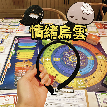我覺得圓夢領航桌遊很特別的一點就是這個『情緒烏雲』,在遊戲裡竟然這麼認真的面對自己的情緒,還特別做了這個髮圈,只要獲得烏雲的人,就真的要帶著這個繼續遊戲。而且你可以選擇要消除情緒烏雲,或者甚至是帶著烏雲繼續遊戲。在過程中可以看到不同的人獲得這坨烏雲時,會用什麼心態面對,還有會怎麼處理。然後每個團隊都會遇到不同的狀況,像有的團隊玩根本沒有人拿到烏雲,但我們這團卻是烏雲差點不夠用,而且只要有人拿到烏雲,就會開始在場面上輪流拿到烏雲~