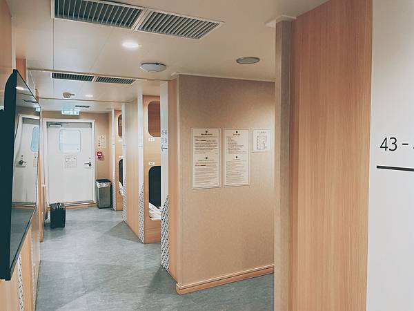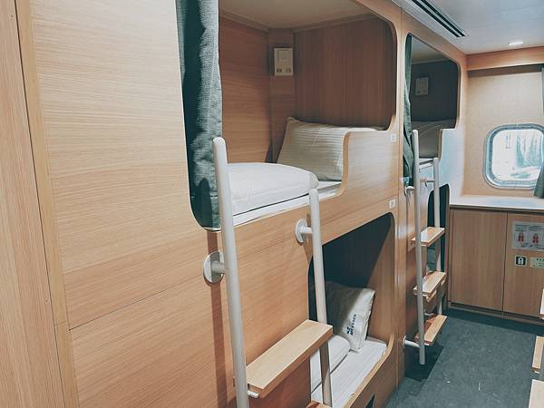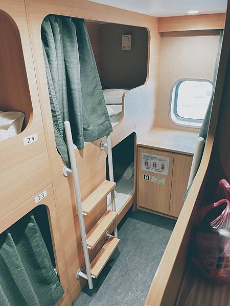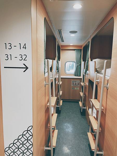 來到臥鋪空間~臥鋪空間算是半開放式的,雖然有門區隔出每個區域,但一個區域裡面會有很多個空間,所以是會聽到其他人的嘔吐聲,或是其他人的打呼聲的!不過因為油輪在行駛中也有海水的聲音,所以整體來說臥鋪區還相對安靜許多!