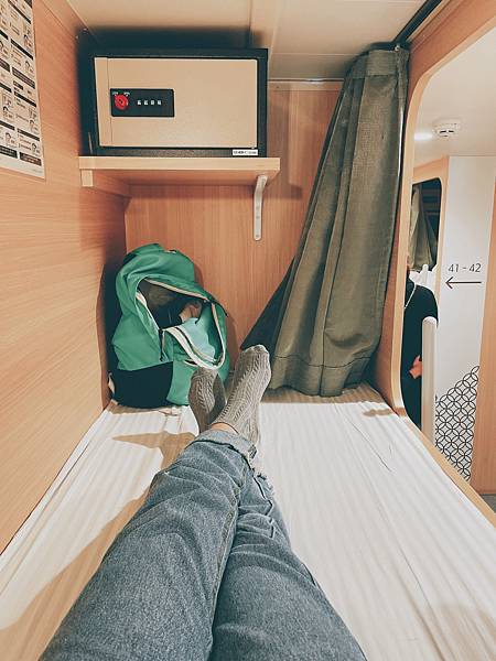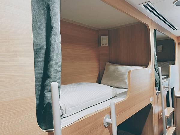 每個臥鋪都會有一個遮光簾,基本上大家不管有沒有要睡覺,都會把簾子拉起來。簾子拉起來躲在裡面的感覺挺好的,我自己好喜歡這種自己的小空間感!然後廁所的部分是公廁,需要走到大房間之外的空間~不過我住的是A區,離廁所還蠻近的,也蠻方便的!至於廁所的部分不會到真的太髒,就是垃圾桶呈現爆滿的狀態。