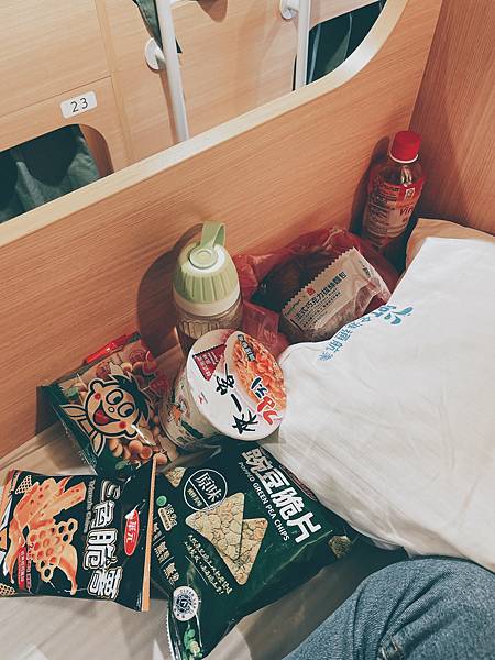 看我在我的小空間準備了超多零食!有的是我在搭船前去超商買的,有的是在船上的販賣機看到很特別就買的!我一直覺得搭船要搭很久,買點食物吃至少可以分散一點注意力!但如果會擔心暈船的,建議還是不要馬上就吃太多,不然會有點不舒服~像我是暈到根本完全沒有胃口。
