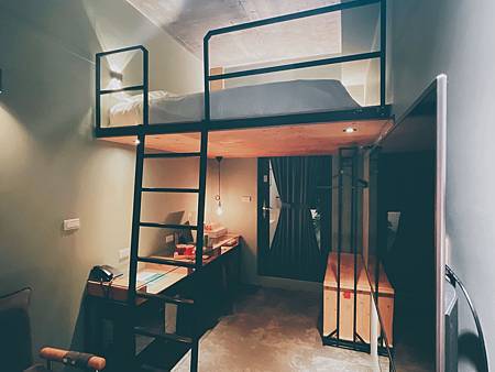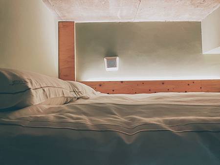 睡覺的空間非常簡單溫馨~可惜因為是樓中樓,所以躺在床上沒看法看電視,然後滑手機時也覺得光線稍微不足,再來就是要避免撞到上面的水泥天花板!除此之外,我對這種樓中樓的設計還蠻新鮮的!當初就是特別中意這個樓中樓的設計,想體驗看看!