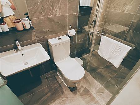 廁所的部分也是質感滿滿~空間不會太大,但是乾濕分離!因為在陽台的關係,所以沒有潮濕感,很通風~比較特別的是他是用電子式熱水器,所以如果用水量比較大時,需要時間等待它加熱!我自己跟男友住的時候是沒有遇到熱水不足的問題,但是這點的確是大家可以評估的。畢竟住宿時,大家回到飯店都急著想洗澡休息!另外,水壓的部分也很足夠,不會太小~
