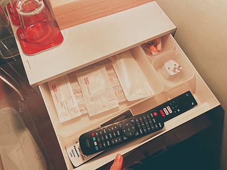 備品跟遙控器也都收得好好的!讓我覺得最療癒的就是抽屜裡面還放有收納盒,然後一個物品一個位置!身為整齊收納控,看到這個真的有被收服到!完全就是種整齊的生活感!