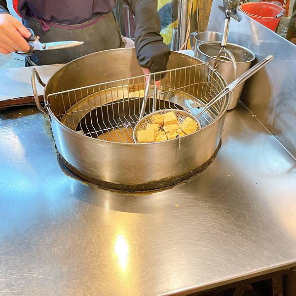 這家臭豆腐的豆腐老闆炸過一次之後,會把臭豆腐剪小塊再炸一次,讓每個邊邊角角都會超級酥脆,