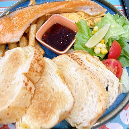 除了鮭魚、炸薯條、沙拉、雞蛋還有麵包,算是種類蠻多的拼盤!