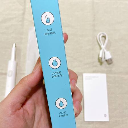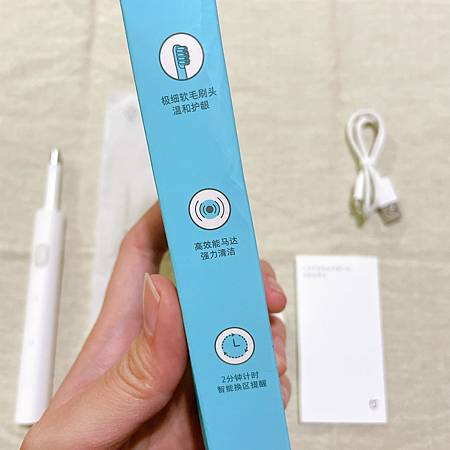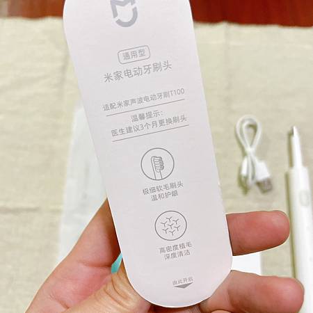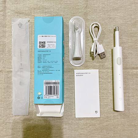 小米T100電動牙刷小小一盒,可是該有的配件都有!除了牙刷本體,還有刷頭、充電線、說明書!刷頭的部分用完可以自行購買!然後品質的部分也都蠻好的,不會有太廉價的感覺呢!