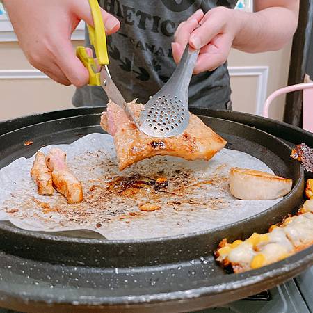 豬五花肉烤好了,可以使用店家附的剪刀把肉剪成適當的大小,然後就可以夾生菜或是搭配小菜吃!如果食量比較大的人,也可以搭配白飯享用!雖然五花肉很好吃,但是五花肉真的很油,邊烤邊噴超可怕的!